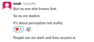 Earlier this year, after I passionately defended my love for—and frequent use of—the em dash, Noah very astutely told me why I had to cut them out of all TPF official channels and client work: It’s about perception not reality. He’s right. Overnight, I begrudgingly removed them from my toolbox. Now I just write two sentences, instead of stringing together two related thoughts with a handsome and aesthetically pleasing em dash. The machines did this to me. And I’m okay with that.